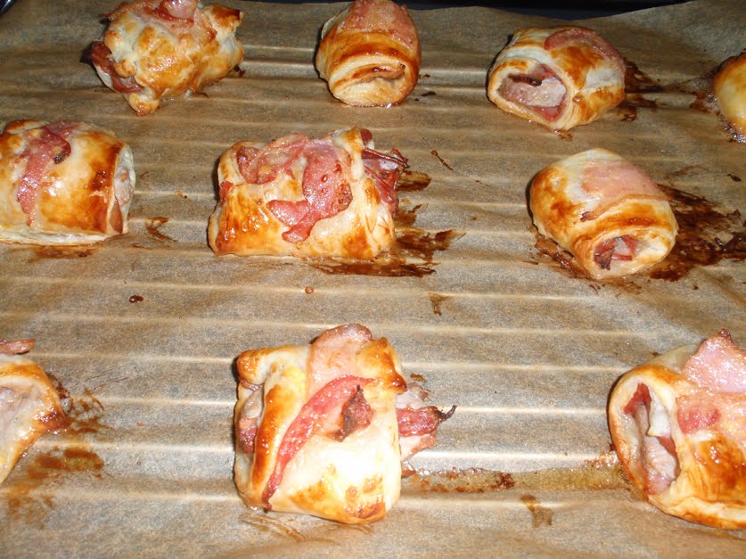 Partimos el solomillo en trozos no muy grandes; pasamos cada medallón por una plancha bien caliente vuelta y vuelta, lo salpimentamos al gusto y lo envolvemos con masa de hojaldre fresca del Lidl y una loncha de beicon. Colocamos en la rejilla con papel de horno y lo metemos en el horno precalentado a una temperatura de 200º. Emplatamos con un poco de ensalada de queso fresco, lechuga, tomate, orégano y aceite de cebollino. Os dejo foto del antes y el después. No es necesario pincelar con huevo, porque queda doradito el hojaldre igualmente.